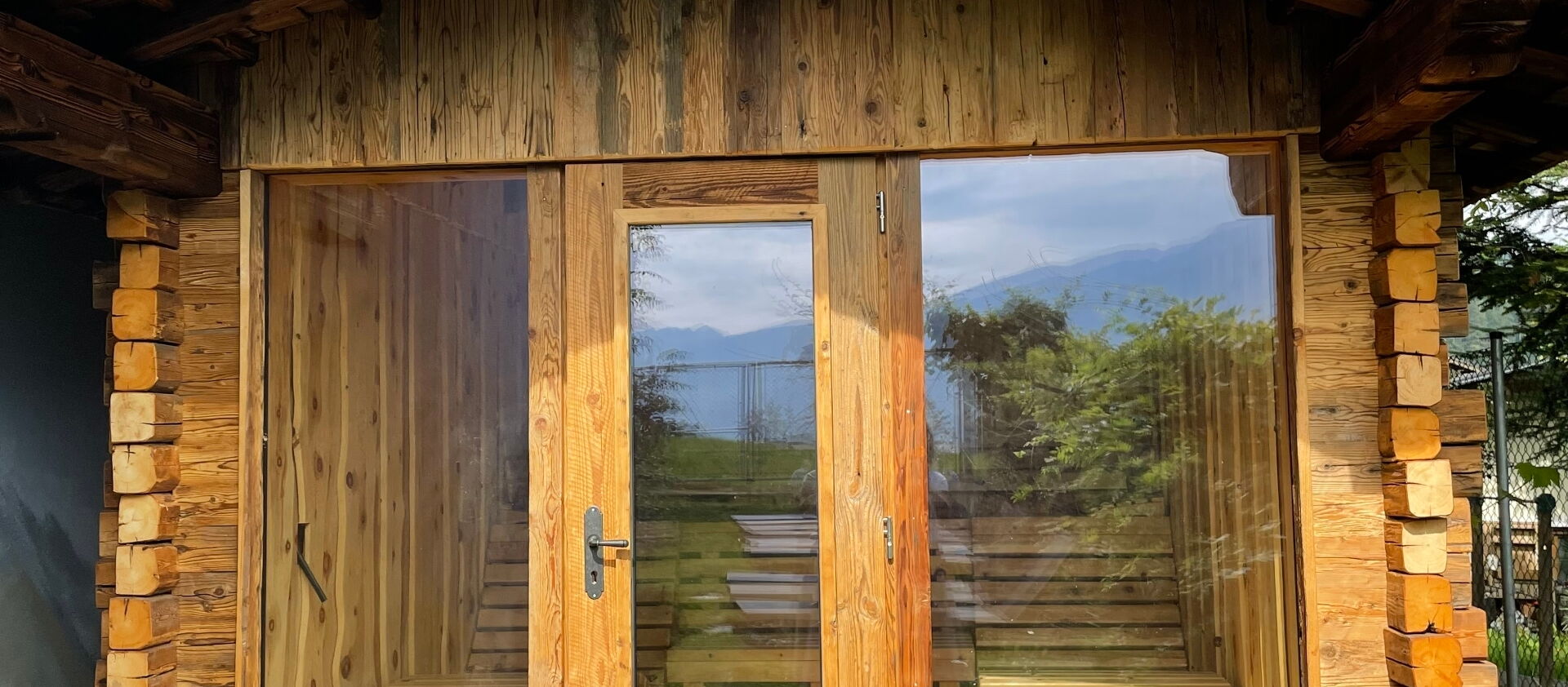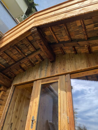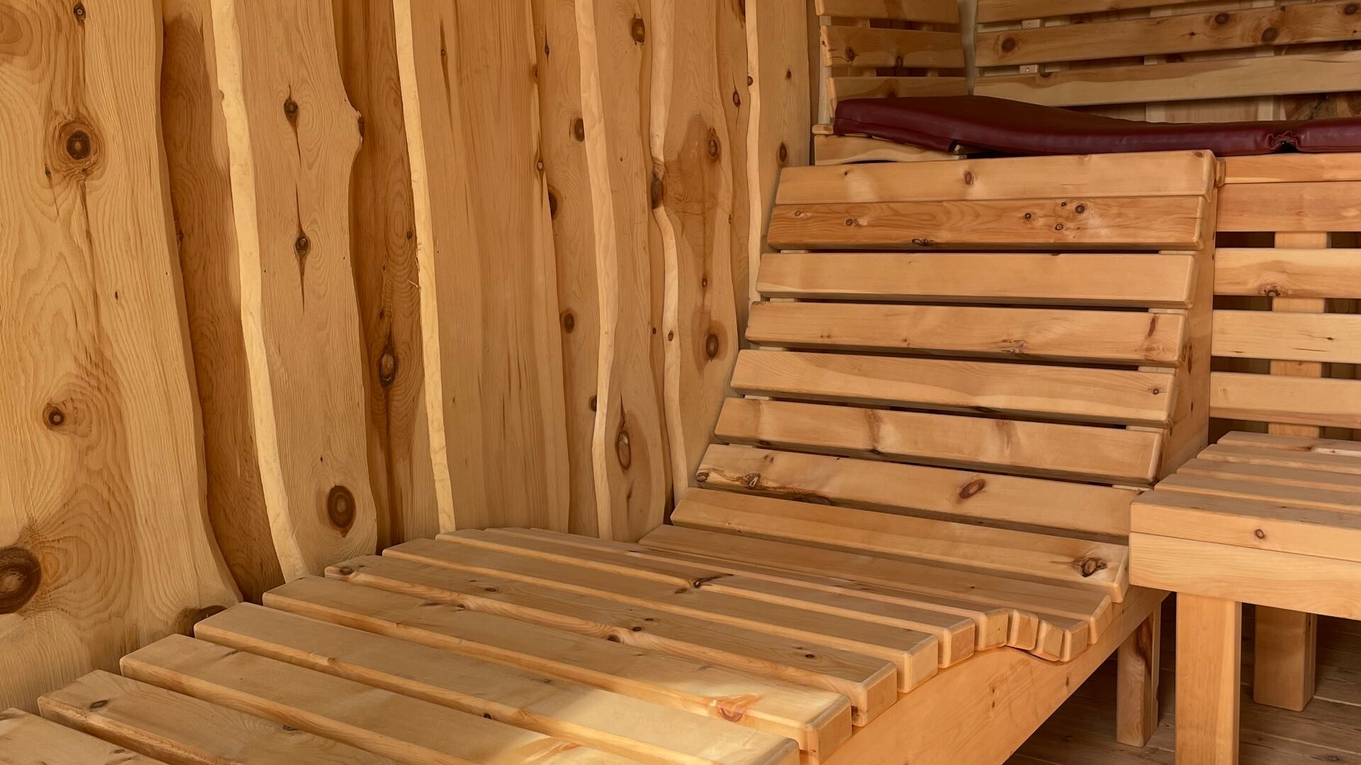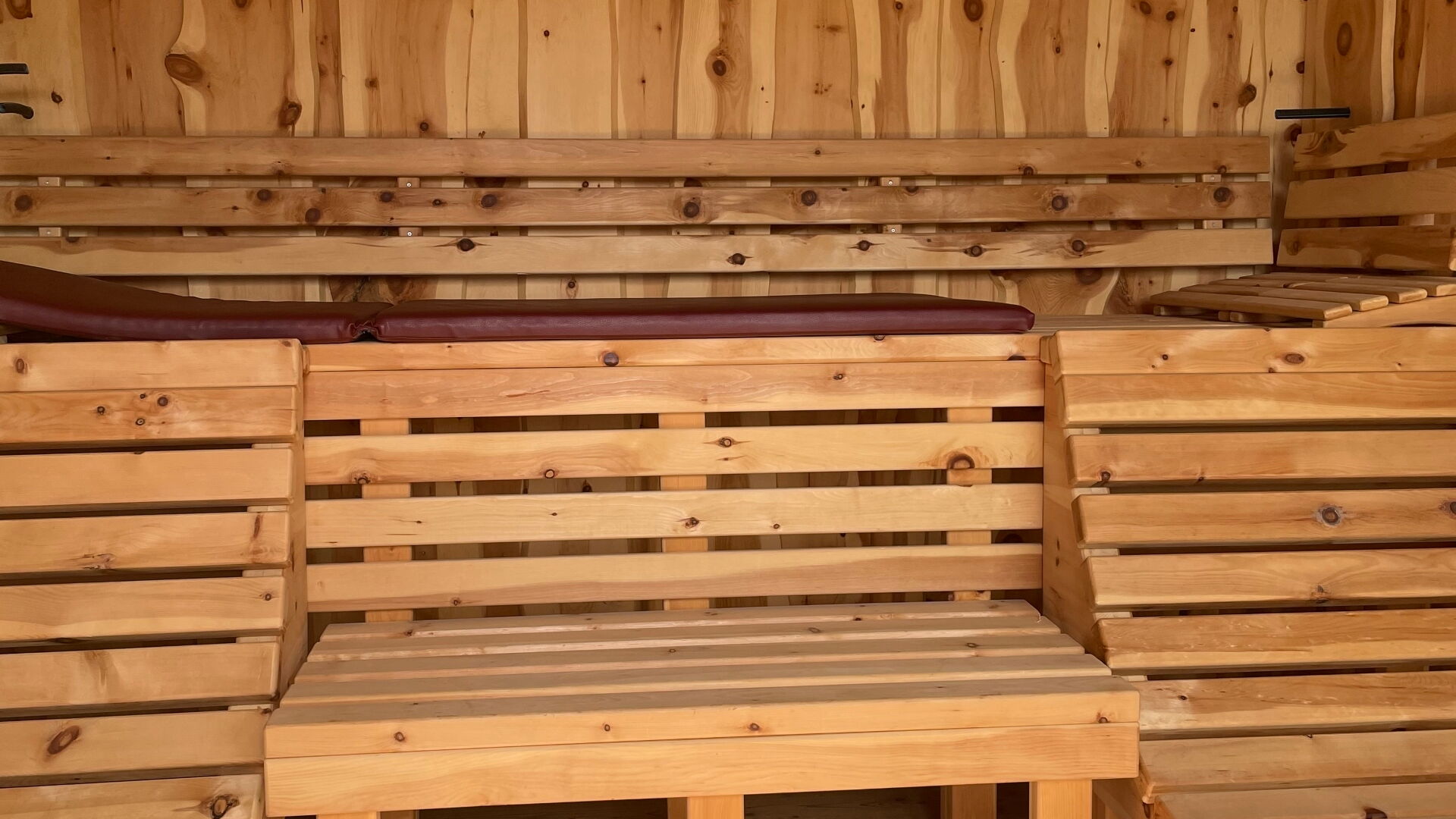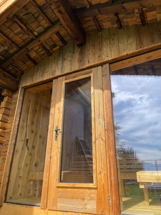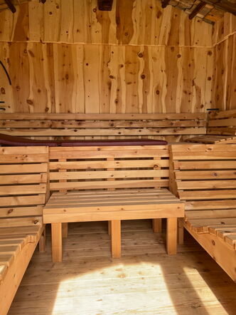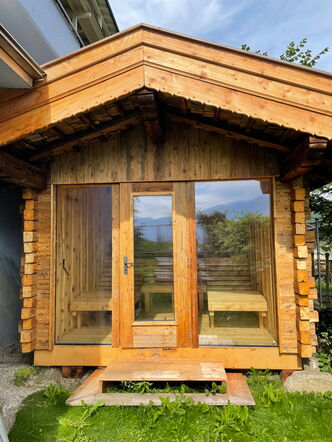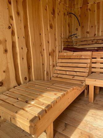 Direkt ans Wohnhaus angebaut, bietet die Saunahütte auf kompaktem Raum Platz für bis zu vier Personen. Innen sorgen zwei Liegen und eine Sitzbank für entspannte Stunden, während die großzügige Glasfront Offenheit schafft und den Blick nach draußen lenkt. Ein privater Rückzugsort, der Wellness auf kleinem Raum groß macht.