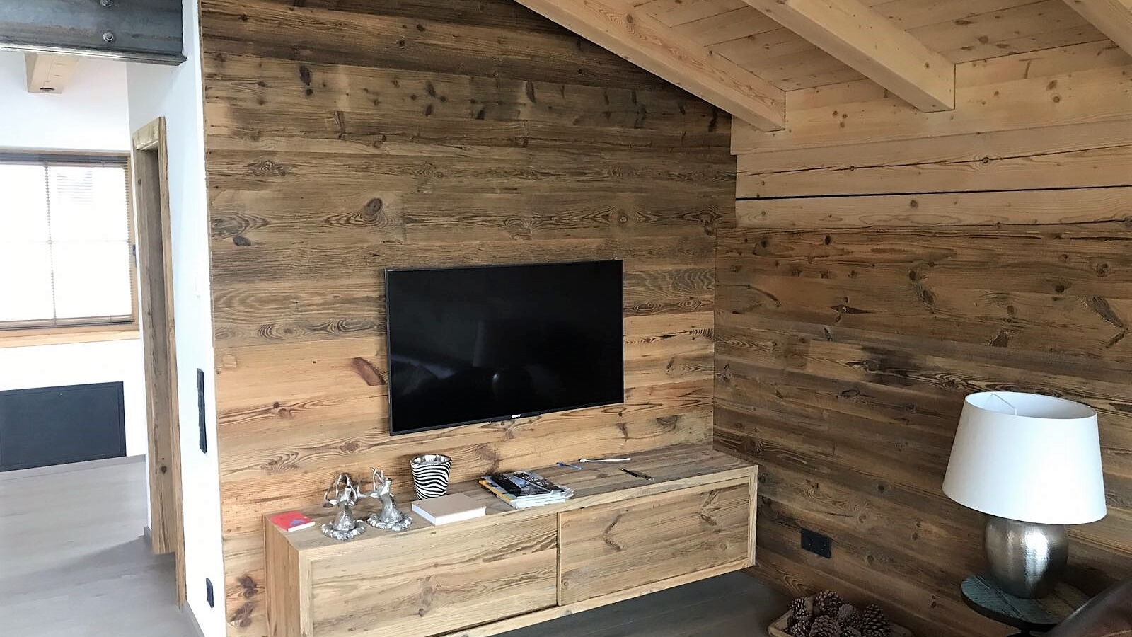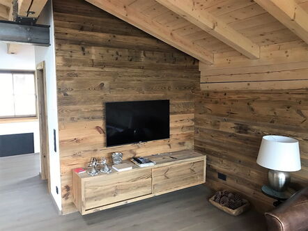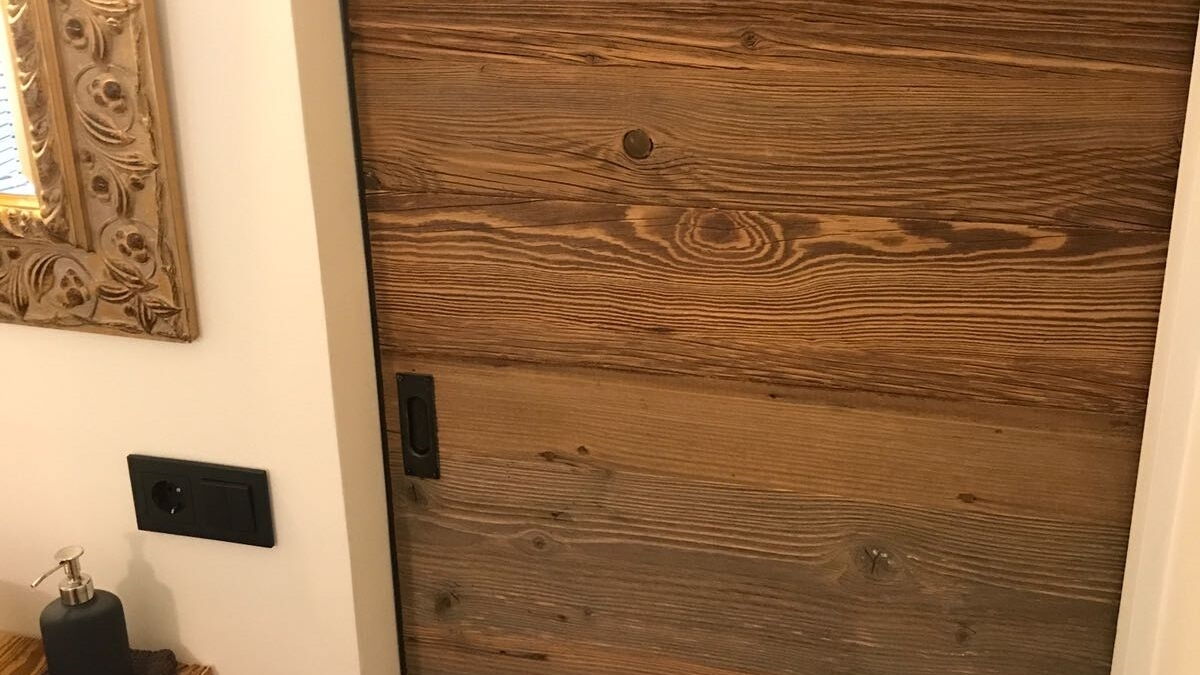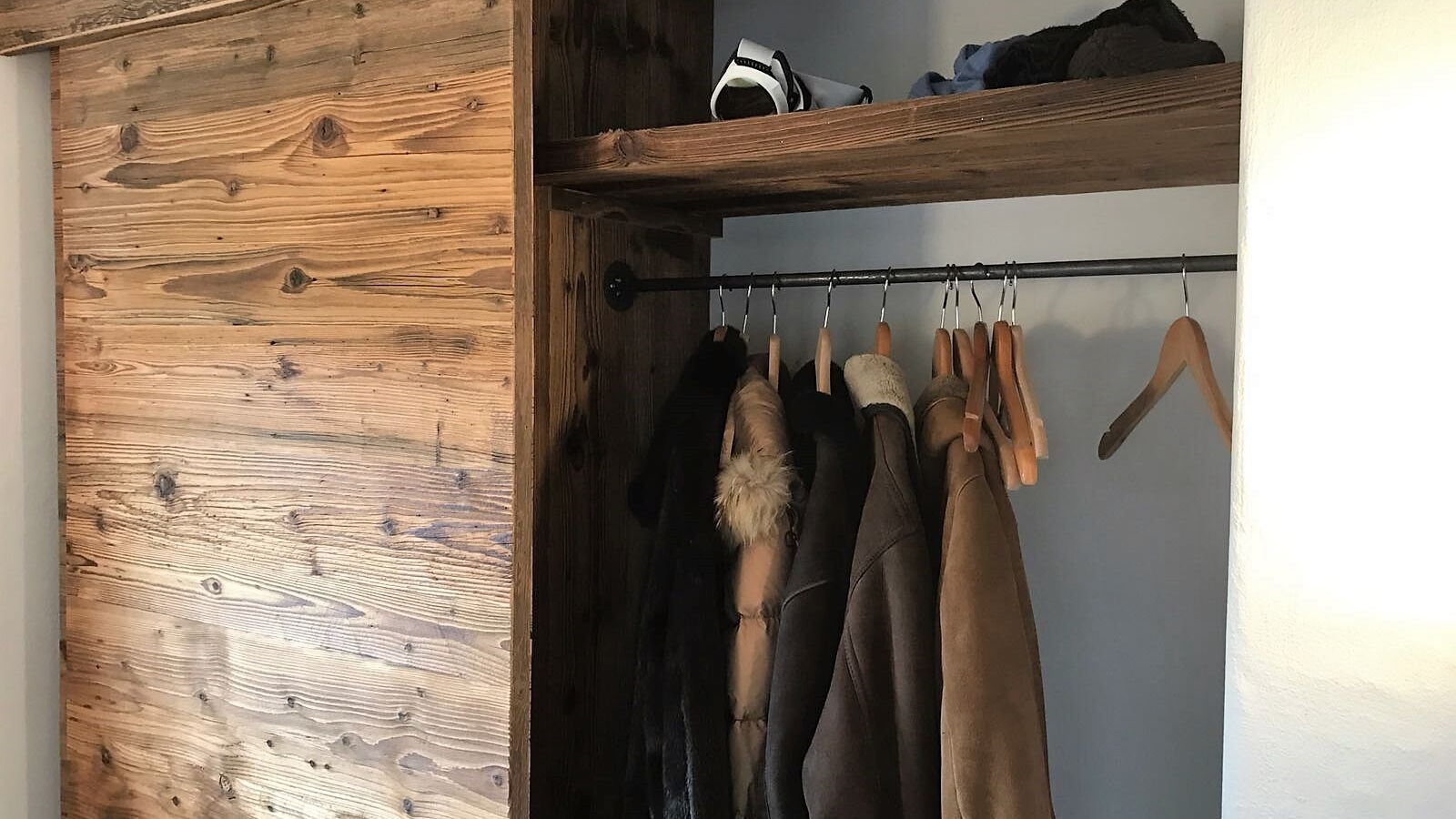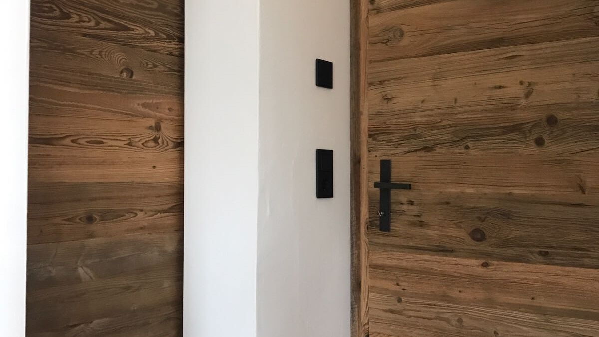 In dieser Wohnung verbinden sich dunkle Holztöne mit cleveren Lösungen wie einer integrierten Schiebetür. Dachgeschoss und Holzverschalungen gehen fließend ineinander über, während das moderne Design klare Linien und stilvolle Details betont. Ein Raum, der moderne Klarheit mit wohltuender Atmosphäre perfekt ins Gleichgewicht bringt.
