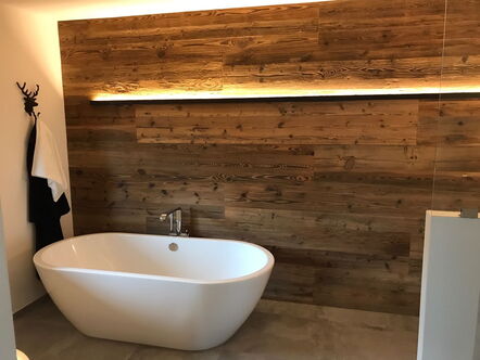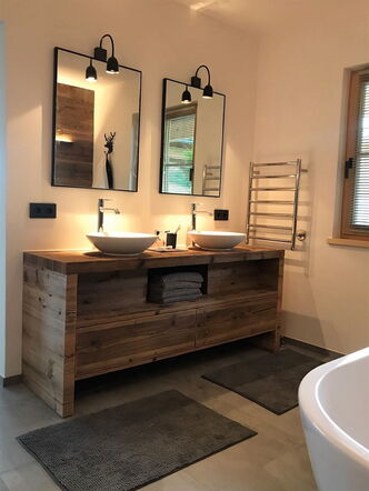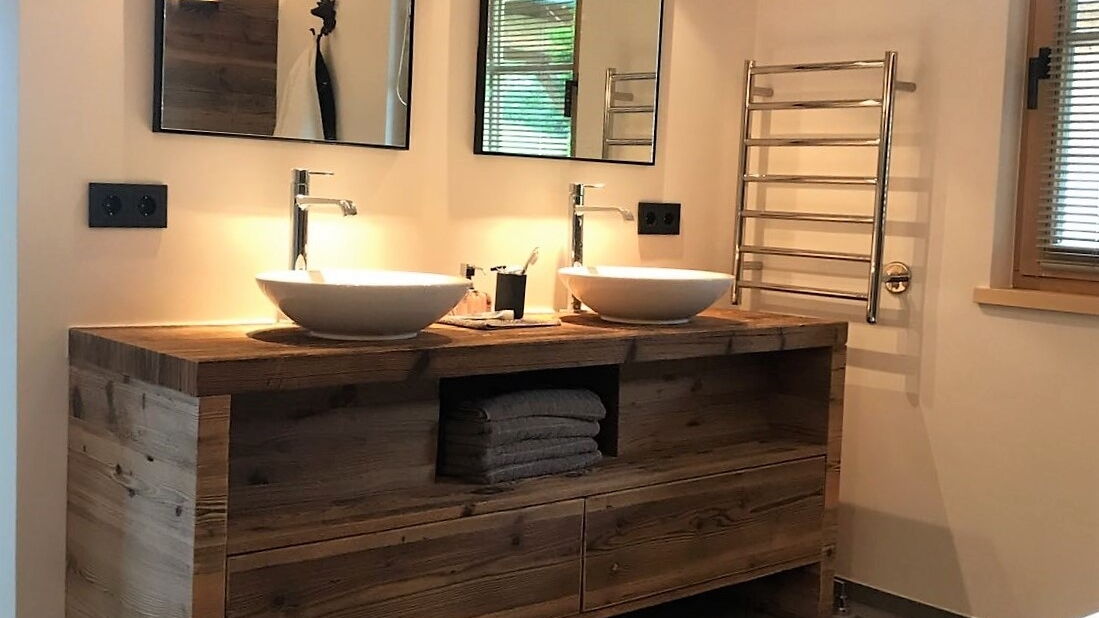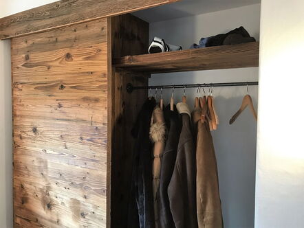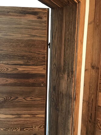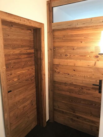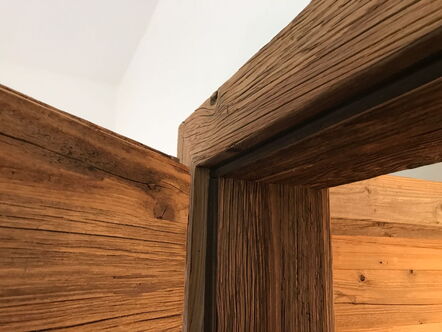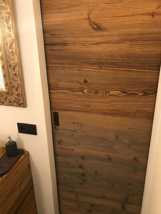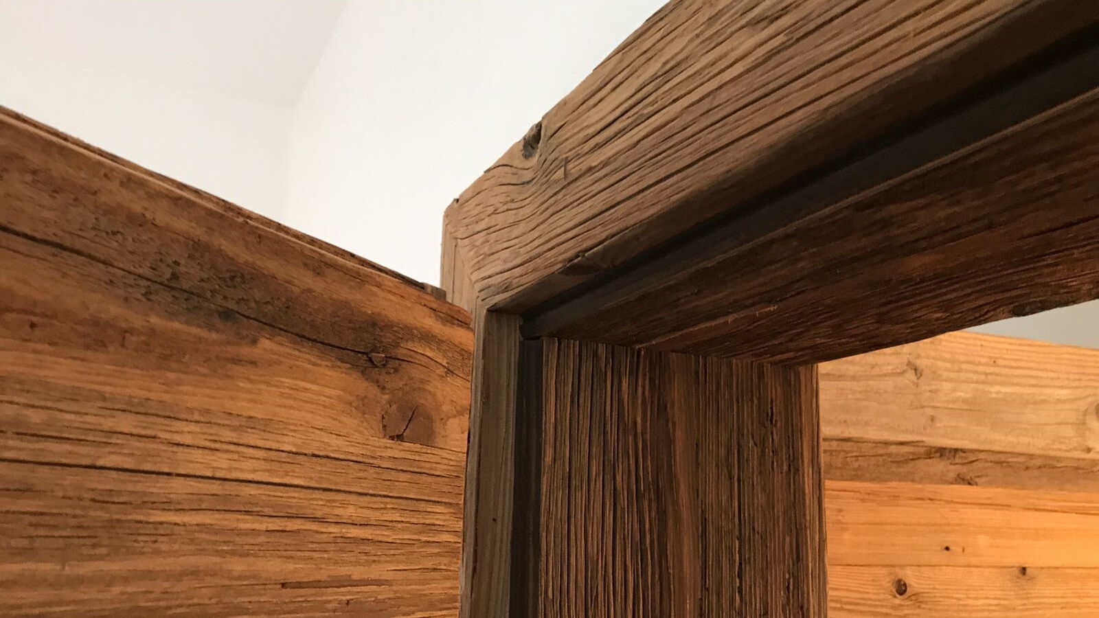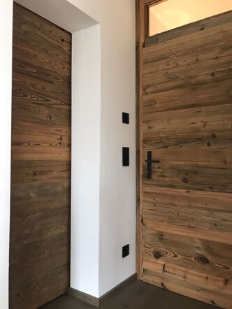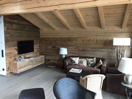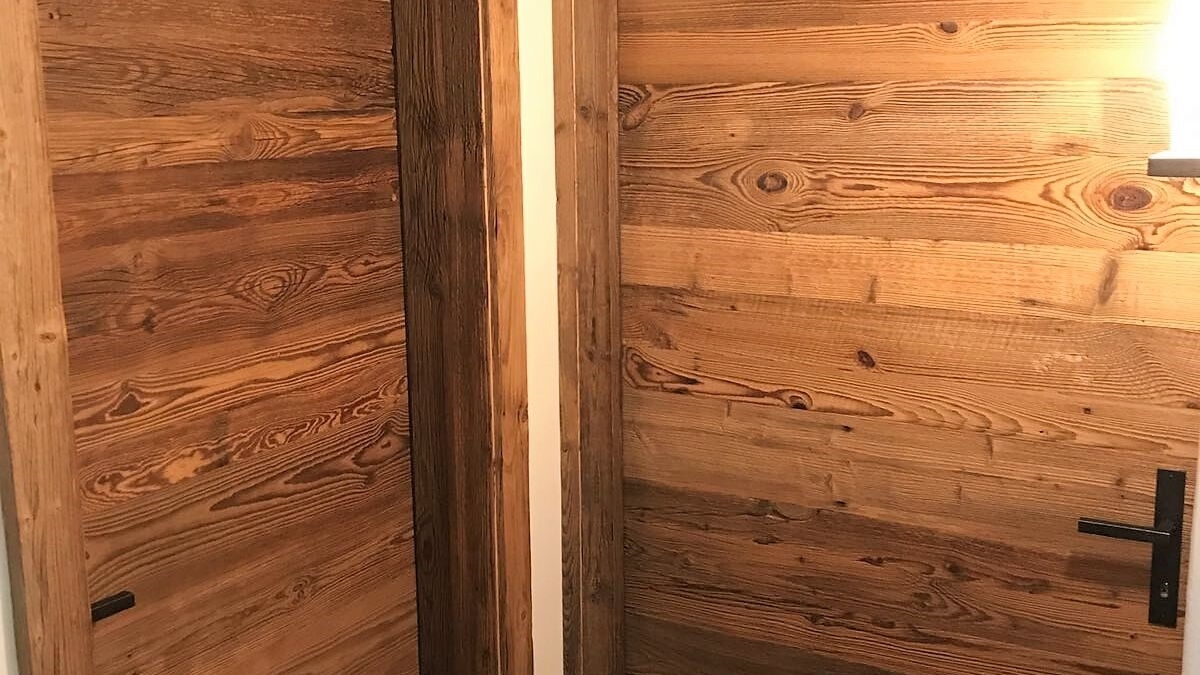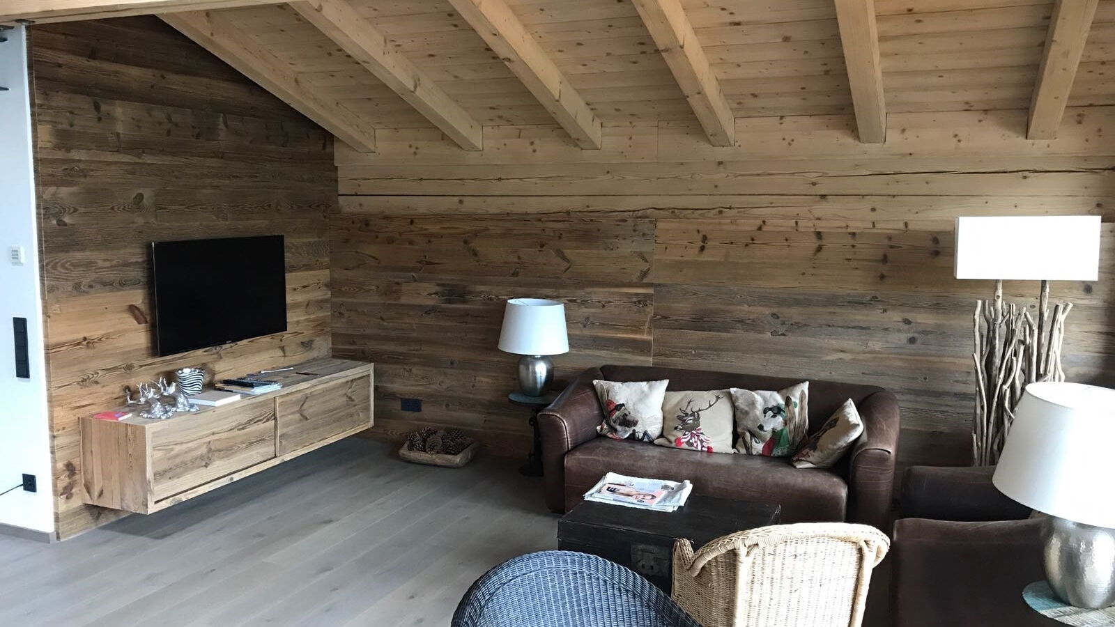 In dieser Wohnung verbinden sich dunkle Holztöne mit cleveren Lösungen wie einer integrierten Schiebetür. Dachgeschoss und Holzverschalungen gehen fließend ineinander über, während das moderne Design klare Linien und stilvolle Details betont. Ein Raum, der moderne Klarheit mit wohltuender Atmosphäre perfekt ins Gleichgewicht bringt.